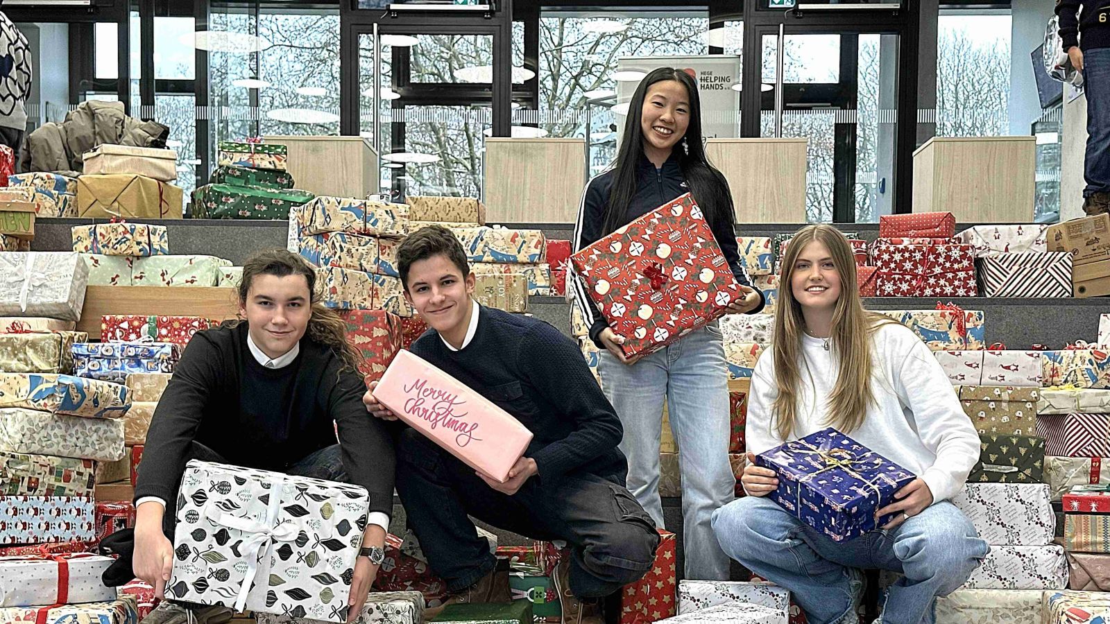 Im Anschluss startete der praktische Teil der Aktion: Punkt 12 Uhr begannen die Kinder und Jugendlichen im gesamten Schulgebäude Adventspäckchen für wohnungslose und bedürftige Menschen zu packen. Mit viel Engagement, Kreativität und sichtbarer Freude füllten sie hunderte Schuhkartons mit Lebensmitteln, wärmender Kleidung, Hygieneartikeln und persönlichen Grüßen. Bereits eineinhalb Stunden später stapelten sich die liebevoll verpackten Geschenke im großen Eingangsfoyer der Schule. Die Pakete werden nun dem Projekt Alimaus zugutekommen, einer Einrichtung des Hilfsvereins St. Ansgar e.V. für bedürftige Menschen. Die Alimaus versorgt täglich zahlreiche Bedürftige mit Essen, Kleidung, medizinischer Hilfe und menschlicher Zuwendung. Eine Schülergruppe wird die Adventspäckchen persönlich überreichen – als sichtbares Zeichen der Wertschätzung und Verbundenheit.