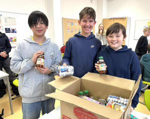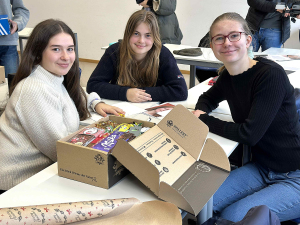Felix, Julian und Timm sind ganz bei der Sache. Geschickt verstauen die Siebtklässler ihre selbst mitgebrachten Hilfsgüter in einen großen Pappkarton. Obendrauf legen sie eine Karte mit handschriftlichen Zeilen an den Empfänger. Geschenkpapier, Schere und Tesa liegen bereit. „Da ist alles dabei, was man so braucht“, erklärt Klassenkamerad Paul am Nachbartisch – und zählt auch gleich beispielhaft Produkten auf: Ravioli, Linseneintopf, Socken, Schokoriegel, Hautcreme und Zahnpasta. „Das ist alles mindestens zwei Jahre haltbar. Und einen Gruß gibt´s auch noch“, ergänzt der Junge, bevor er sich wieder dem Kartenschreiben widmet.