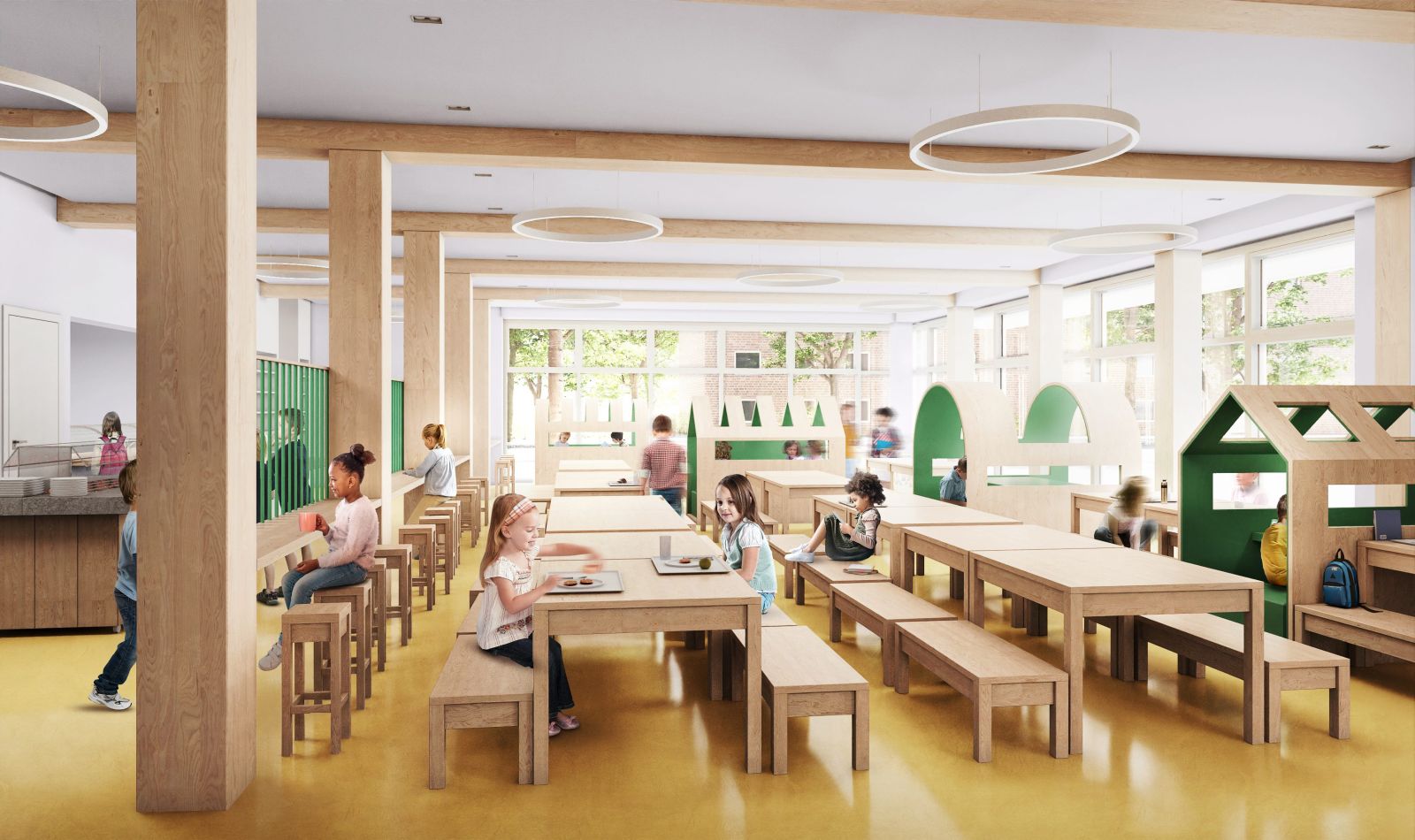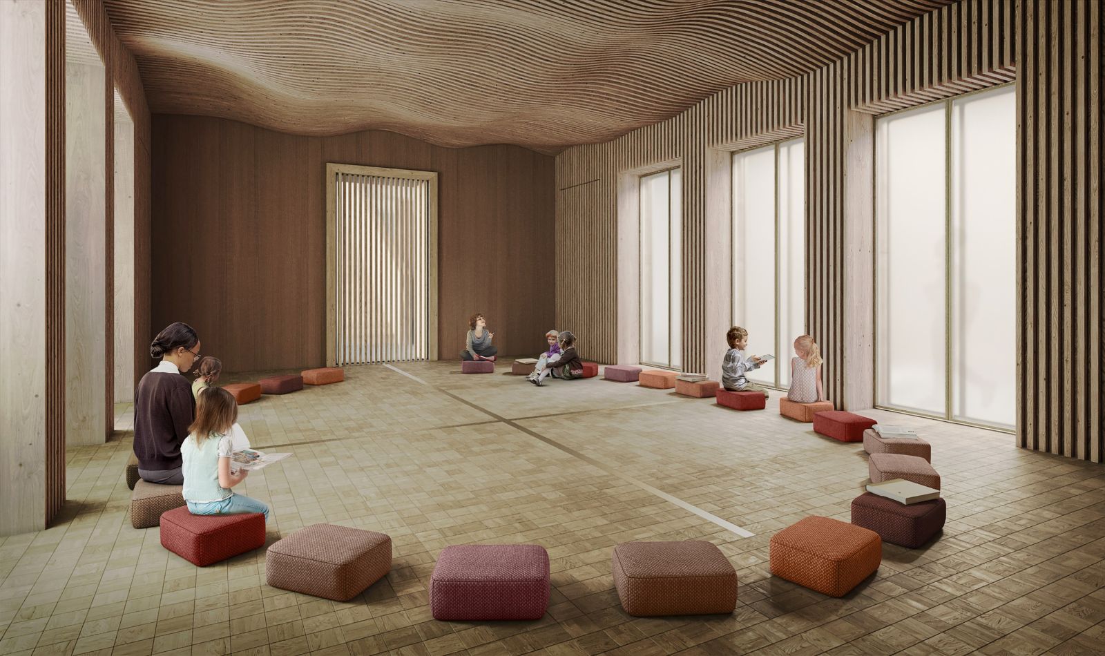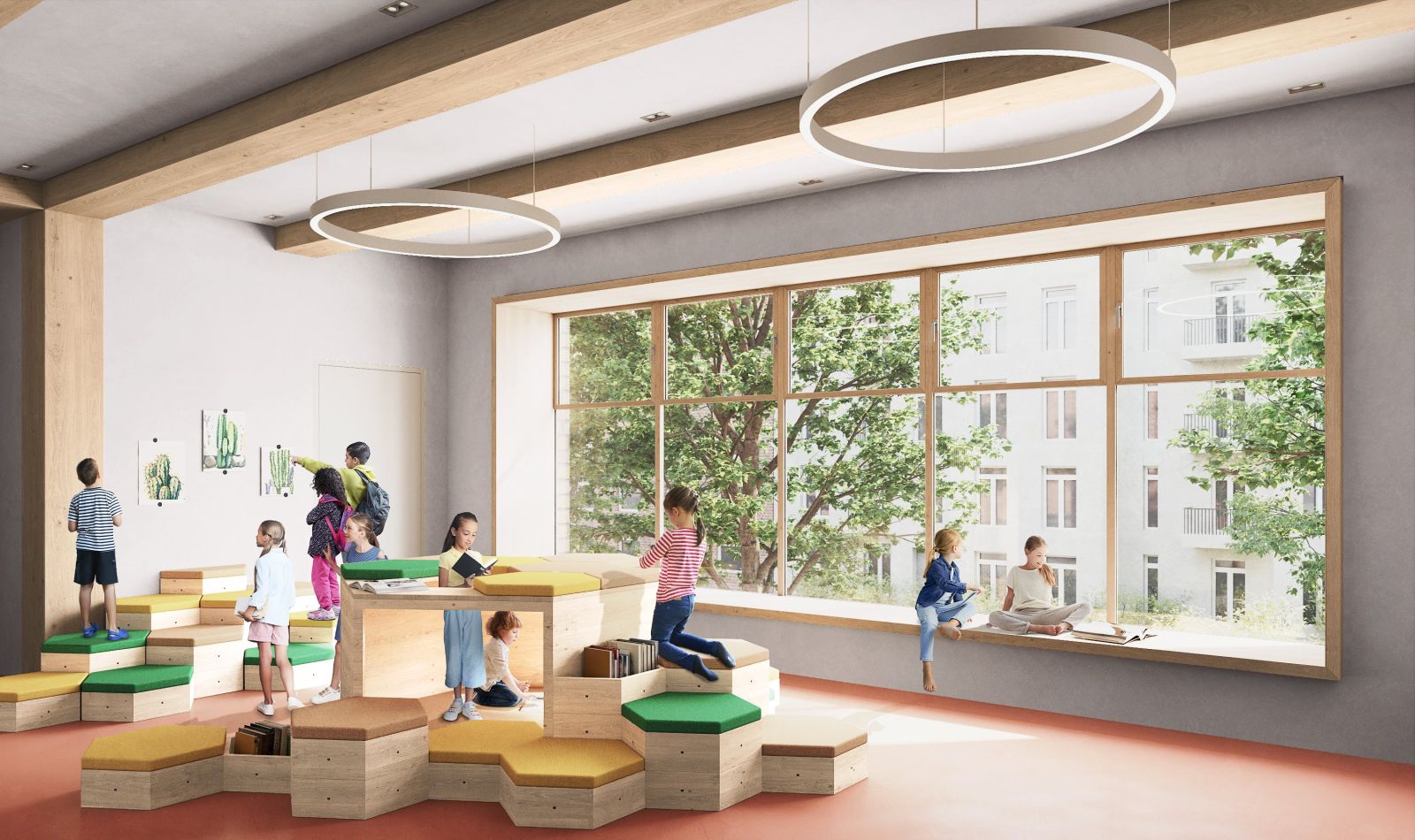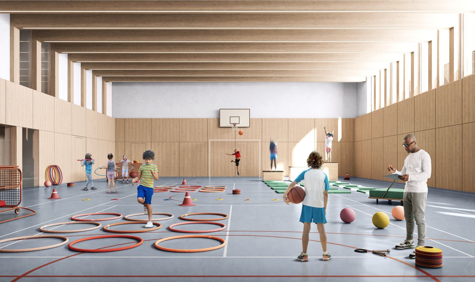 Weil Kinder heute einen Großteil ihres Alltags in der Schule verbringen, wurde der Ganztagsgedanke architektonisch besonders berücksichtigt. Eine große Sporthalle – halb ins Untergeschoss eingelassen –, eine helle Mensa, die multifunktionale Aula für Musik, Theater und Veranstaltungen, eine zentrale Lesetreppe sowie Bibliothek und ein Raum der Stille schaffen ein Umfeld, das Bildung, Bewegung, Kultur und Rückzug gleichermaßen ermöglicht. Mobile Bühnen- und Lichtmodule bieten im Erdgeschoss zusätzliche Nutzungsmöglichkeiten für Konzerte, Versammlungen und kreativen Unterricht. Der Pausenhof wird durch große Fensterelemente in das schulische Leben einbezogen.