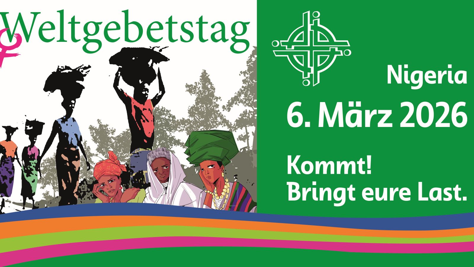 „Kommt! Bringt eure Last“. Das Motto der Weltgebetstags-Liturgie 2026 erinnert an die Einladung Jesu im Matthäusevangelium. Das Bildmotiv dazu hat die nigerianische Künstlerin Gift Amarachi Ottah geschaffen. Auf dem Bild sind drei Frauen der größten Ethnien Igbo, Haussa und Yoruba zu sehen. Im Hintergrund tragen Frauen Lasten auf dem Kopf, wie es in Nigeria üblich ist. Aber es gibt für die nigerianischen Frauen auch unsichtbare Lasten wie Armut und Gewalt, auf die der Weltgebetstag aufmerksam macht.