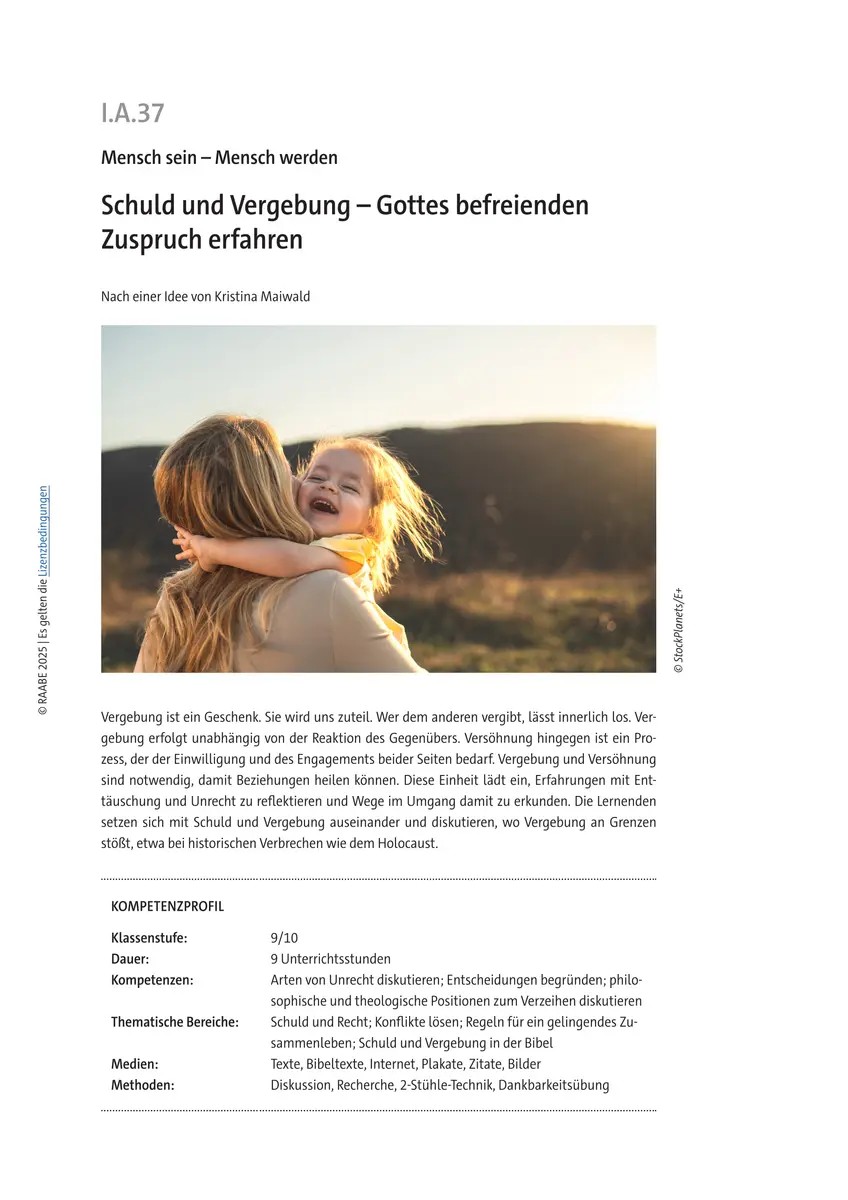 Schuld und Vergebung - Gottes befreienden Zuspruch erfahren Klassenstufe 9/10 / Kristina Maiwald. - Stuttgart: Raabe, 2025. - 32 S.: Ill., Materialheft (RAAbits Religion - Mensch sein, Mensch werden ; A37) Schlagwörter: Schuld; Vergebung; Verzeihen; Strafe; Strafrecht; Holocaust; Mozes Kor, Eva Ordner: Schuld und Vergebung ----- Diese Unterrichtseinheit lädt ein, Erfahrungen mit Enttäuschung und Unrecht zu reflektieren und Wege im Umgang damit zu erkunden. Die Lernenden setzen sich mit Schuld und Vergebeung auseinander und diskutieren, wo Vergebung an Grenzen stößt, etwa bei historischen Verbrechen wie dem Holocaust.