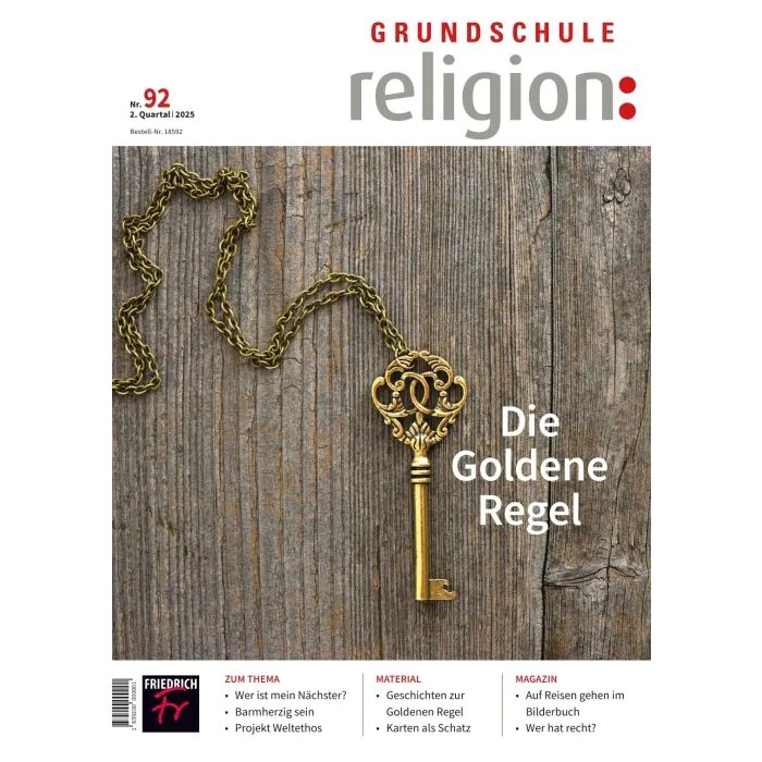 Was nützt mir Religion? Hannover: Friedrich, 2025. - 63 S.: Ill., 1 Spielplan A4, 3 Bildkarten A4, 42 Fragekärtchen im Umschlag, Materialheft (Religion 5 bis 10 ; 59) Schlagwörter: Religion; Ethik; Religionsunterricht; Schatz; Schatzsuche; Ritual; Lieblingsort; Kirchenraum; Glaube; Demokratie Ordner: Religion --- Themen des Heftes: Klasse 5/6: "Was macht ihr in Reli? - Gedankenexperimente zu Religion und Ethik / "Religion(en) als Schatz entdecken" - Eine Schatzsuche nach Religion(en) an außerschulischen Lernorten --- Klasse 7/8: "Morgenroutine, Study Aesthetics, Meditation und Gebet" - Alltägliche und religiöse Rituale entdecken, erleben und kritisch reflektieren / "Orte von Bedeutung" - Lieblingsorte, religiöse Andersorte, kirchliche Orte --- Klasse 9/10: "Wie hältst du's mit der Religion?" - Zwischen Zuspruch, Anspruch und Unglaube / "Braucht Demokratie Religion?" - Impulse zu einer nicht ganz leichten Verhältnisbestimmung