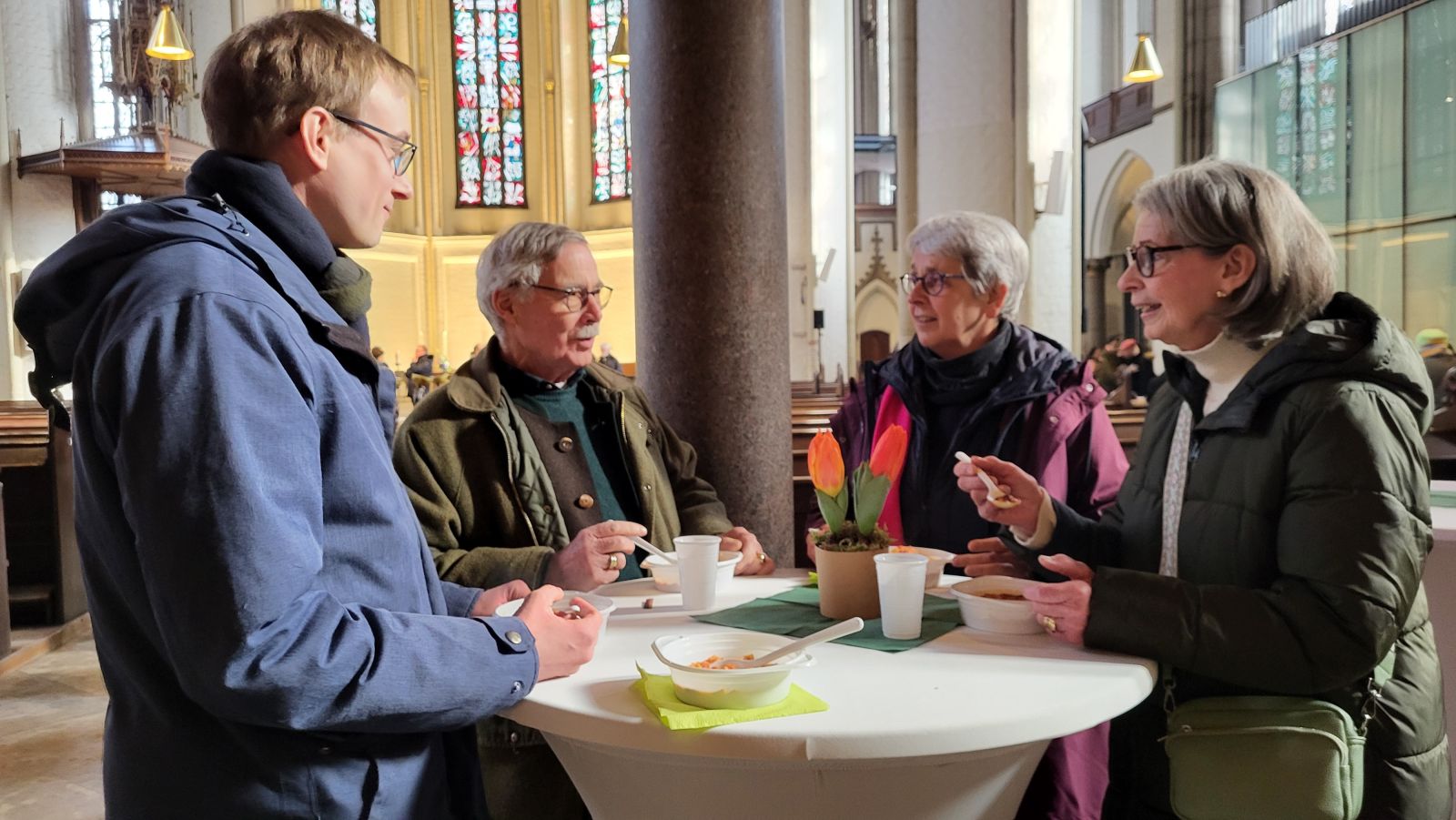 Beim gemeinsamen Mittagessen im Südschiff der Kirche hatten Besucherinnen und Besucher Gelegenheit ins Gespräch zu kommen. Den Abschluss bildete eine Heilungsandacht mit Gesang, Gebet sowie persönlichen Segnungen und Salbungen.