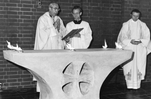 Bilder aus der Bauphase Mitte der 1970er Jahre und der Weihe der Kirche St. Martin durch Bischof Heinrich Theissing, den damaligen Apostolischen Administrator, aus der Chronik der katholischen Kirche in Mecklenburg, Band 3.