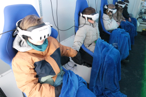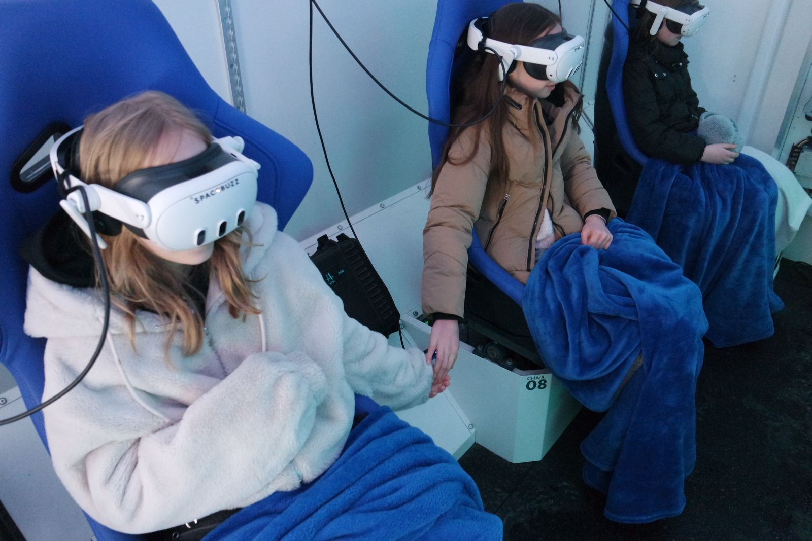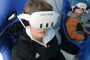 Die 19 Tonnen schwere Rakete liegt auf einem LKW-Transporter. Darin sind zehn Plätze mit beweglichen Stühlen. Alle halbe Stunde steigt eine neue Besatzung in die Rakete und setzt die VR-Brillen auf. Dann heißt es auch schon „Mission Control – Wir sind bereit!“. Die 15-minütige virtuelle Reise beginnt. „Wir wurden beim Start durchgeschüttelt und haben dann die Sterne und die Erde vom Weltall aus gesehen“, sagt Lilli Marie aus der 6. Klasse. Begleitet wird die Crew jeweils von den deutschen Astronauten Alexander Gerst und Matthias Maurer. Vorbei an ein paar Satelliten ging es auch einmal um den Mond. „Von der Erde aus sieht der Mond immer gelblich aus. Er ist aber vollkommen weiß“, staunt die Zwölfjährige. Und so schnell wie die Reise begonnen hat, ist sie auch schon wieder vorbei. „Ich fand das richtig cool“, sagt Marielle zurück auf der Erde. Vor allem durch die VR-Brille habe das alles sehr echt gewirkt.